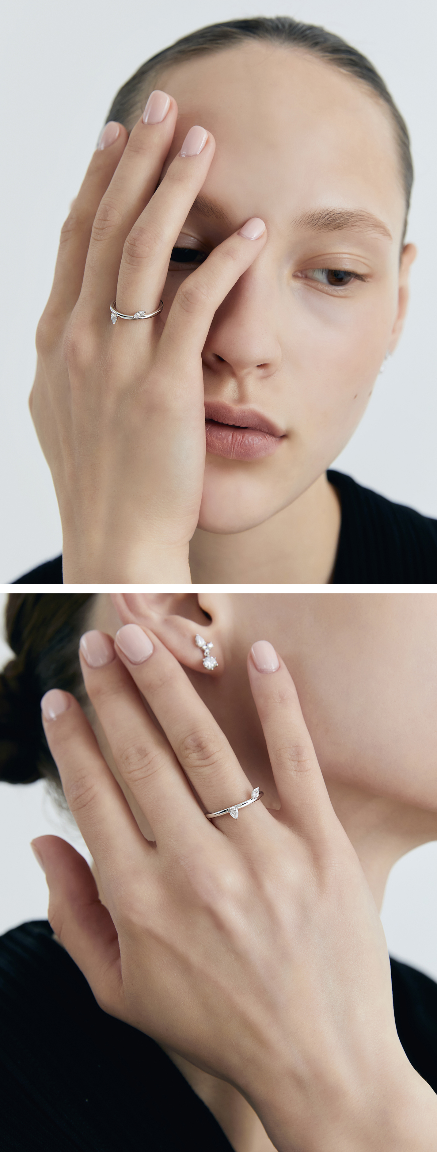 슬림한 밴드에 감각적인 스톤 세팅으로 솔리테어링과의 매칭, 레이어드링과의 매칭 또한 자유롭습니다.
