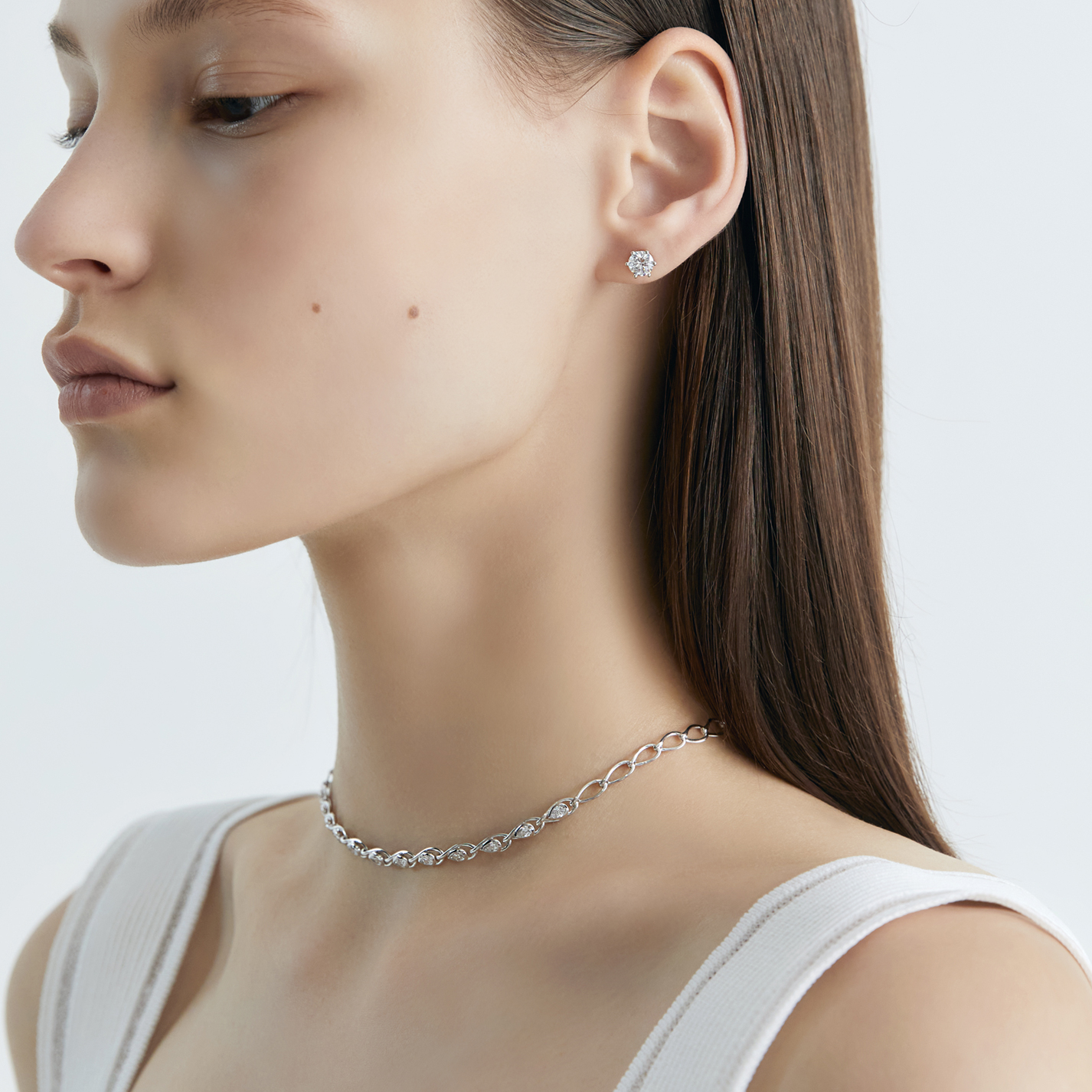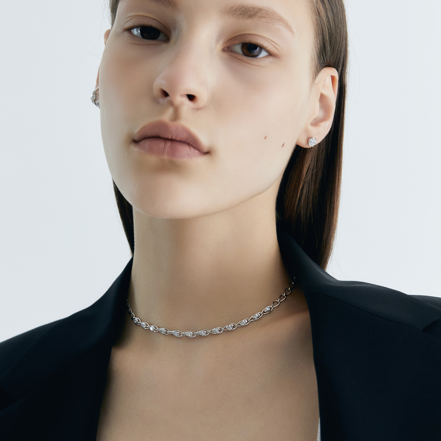 우아한 실루엣의 체인과 페어 컷 다이아몬드의 조화, 낭만적이며 유니크한 이미지로 빛의 흐름을 연출합니다.