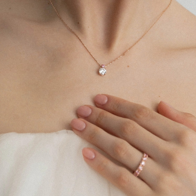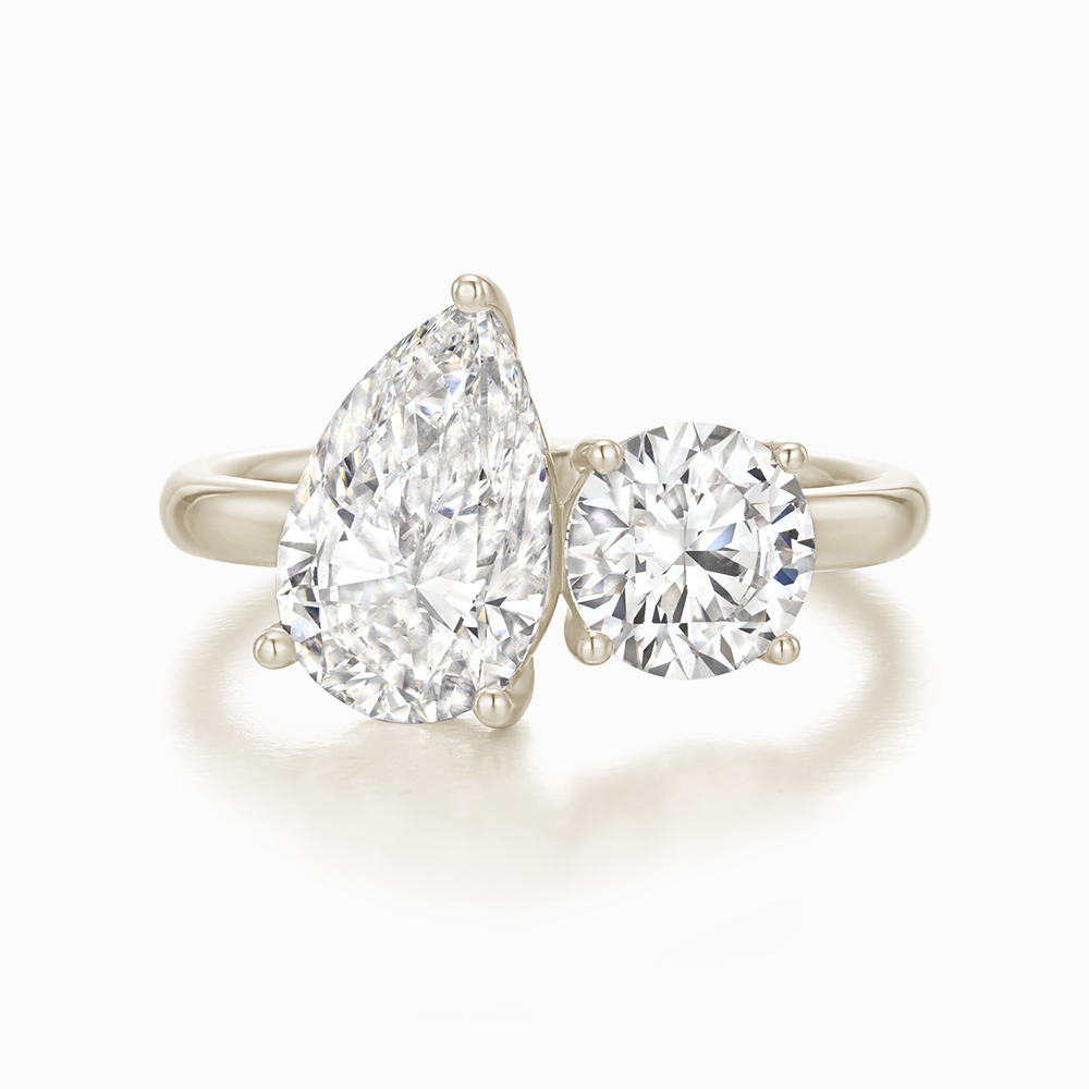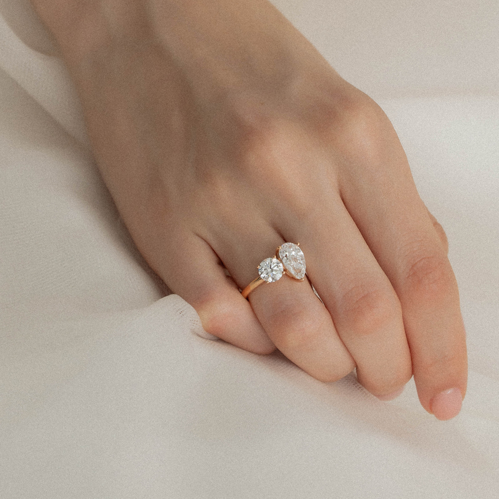 서로 다른 매력을 지닌 페어 컷과 라운드 브릴리언트 컷 다이아몬드가 만나 '너와 나'의 특별한 연결을 상징합니다.